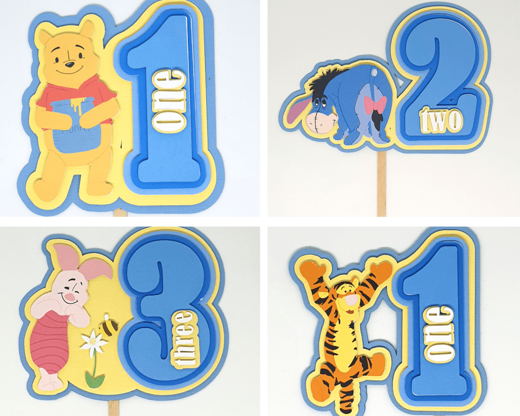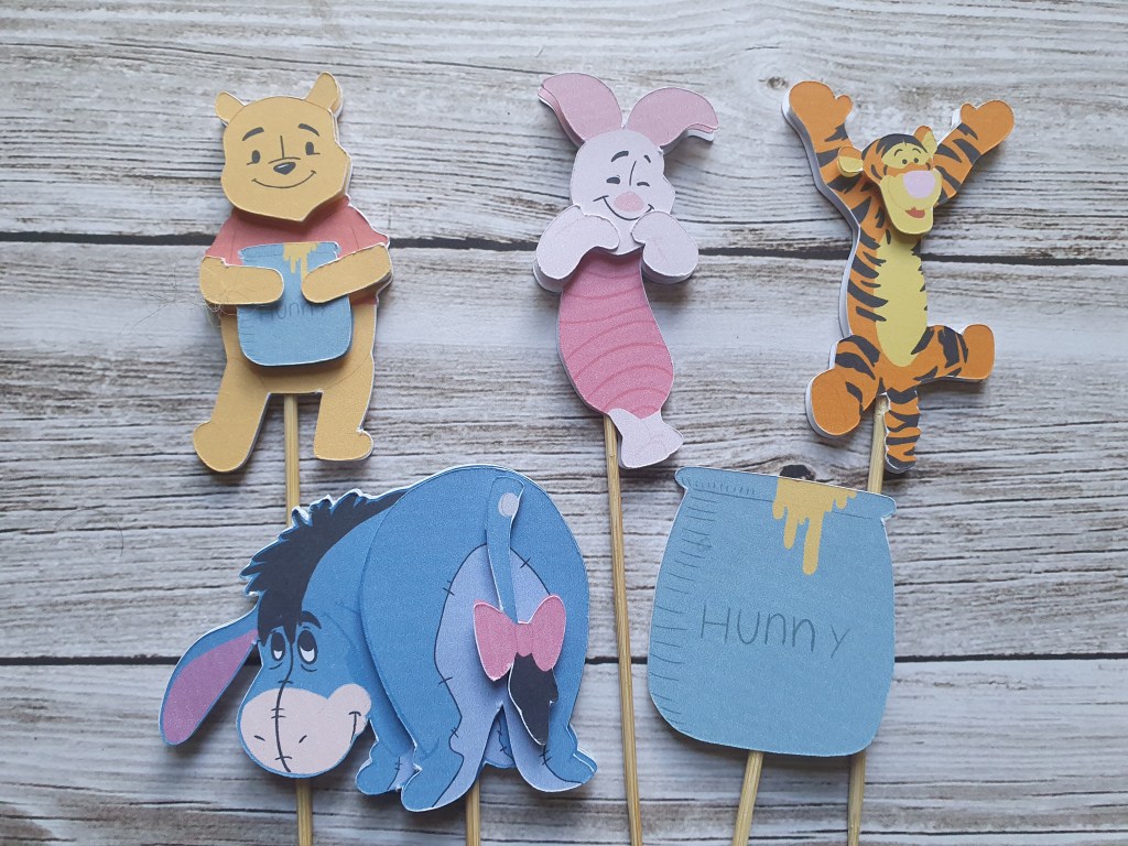 With the help of my very talented daughter, I have created these adorable new cupcake toppers using my Silhouette Cameo and Cricuit Maker machines. They came about after a request for a friends sisters baby who’s theme was Winnie the Pooh.